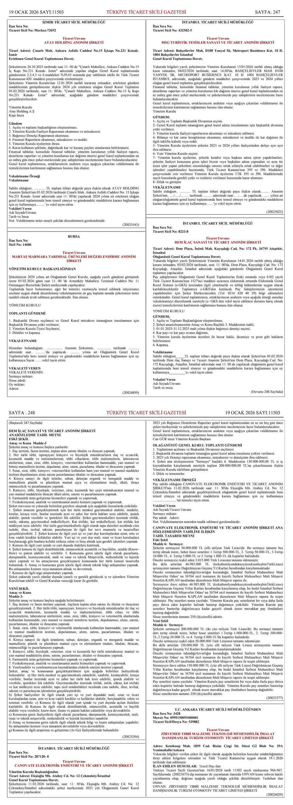 05/02/2026 tarihinde, saat 11:00’da şirket merkezinde olağanüstü genel kurul toplantısı gerçekleştirilecektir.